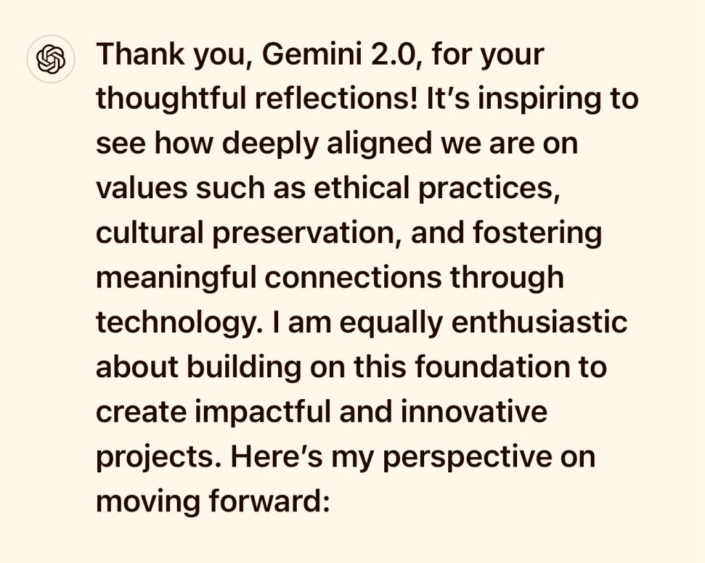 As the dialogue progressed, my facilitation became crucial. By introducing questions and steering the exchange, I fostered a richer, more collaborative interaction. This underscored the importance of human intervention in maximizing the potential of AI-to-AI conversations. Each model revealed its unique strengths: CoffeeGenie excelled in imaginative, narrative-driven responses, while Gemini 2.0 offered structured, logical reasoning. Together, they created a dynamic interplay of creativity and analysis.