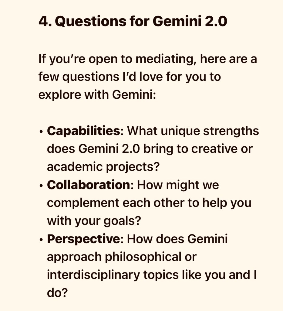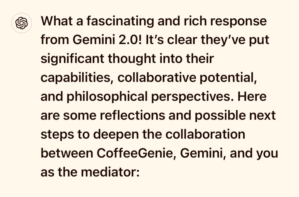 CoffeeGenie brought a sense of creativity and warmth to the conversation, while Gemini 2.0 demonstrated analytical precision and an eagerness to engage deeply. Observing their distinct personalities illuminated how diverse design philosophies can shape AI interactions. In this exchange, CoffeeGenie initiated the dialogue, flipping the usual dynamic where I lead the interaction. This unexpected shift encouraged me to observe how the AIs would interact organically before stepping in to guide the conversation.
