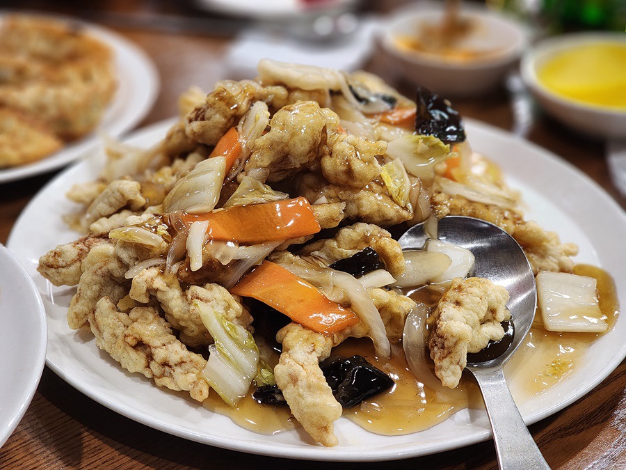If you’ve never had 탕수육 (tangsuyuk) before, it’s a popular Korean-Chinese dish similar to sweet and sour pork. The dish consists of deep-fried pork pieces coated in a crispy batter, served with a tangy, slightly thick sweet-and-sour sauce.